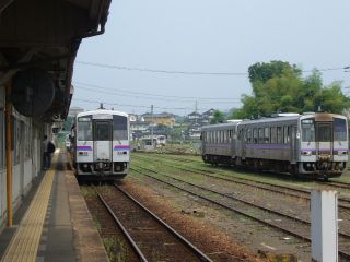 13:44車庫。 三次駅だと、広島駅とは違い簡単にキハ120形が見られる。 |