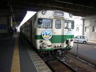 14:01先ほど待機していたキハ120系三江線仕様が、三次駅ホームに口羽行きとなって入線してきた。 |