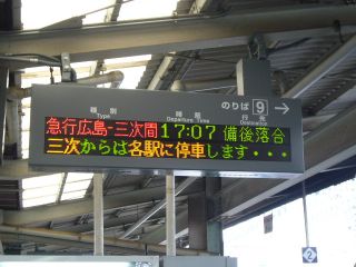 16:27「広島⇔備後落合」の表示。 備後落合へ行く便も乗ってみたかった。 |