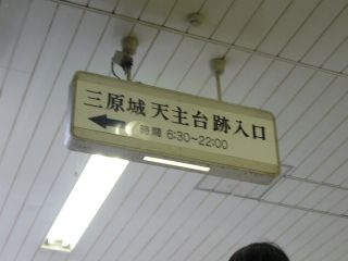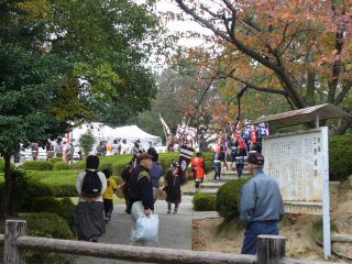 ひらけた所で武士たちの歩みは止まった。 集まった所にあった看板の文字は「三原城跡」。 |