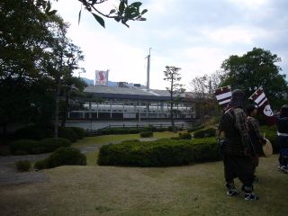 集まった所で、武士の代表が宣誓のようなことをしていた。 そしてまず気になったのが、紫地に「大学祭」ののぼり。 せっかくなのでビデオカメラに収めることにした。 |