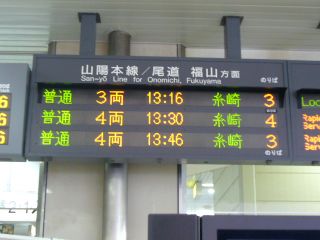 見事にオール糸崎行きです! わざわざ糸崎で乗り換えるってどうよ…仕方ないか。 私は、13:16発の3両の糸崎行きに乗ります。 |