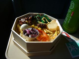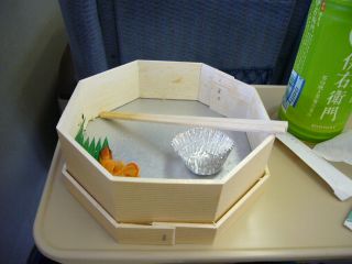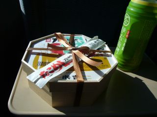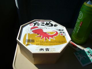 紐をほどきました。 何故か下向き加減のタコと、右端には正真正銘の駅弁の印である駅弁マークがプリントされています。 価格は900円ナリ! 通常の弁当より高いだけに、期待大です。 |