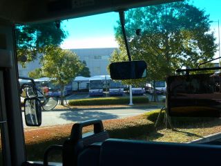 10:36広島空港の敷地内に入ると、リムジンバスの駐車場に同じデザインのバスがずらっと。 |
