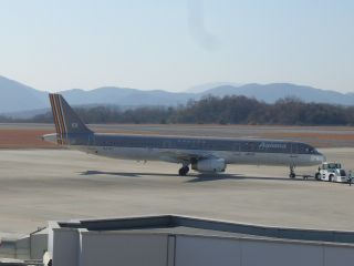 アシアナ航空です。 韓国を本拠地とし、ここからはソウルへ飛んでいます。 |