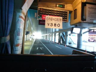 15:06車内も高速バスっぽいですが、運行上は路線バスだそうです。 眺めが良い左前の席に座ります。 料金表示機には大きく「白市駅⇔広島空港 \380」とありました。 |