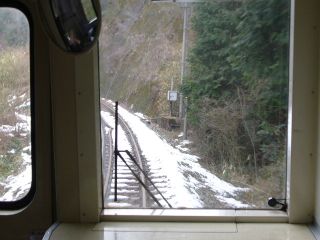 11:51運転士の真後ろのロングシートで前面展望を確保! ですが、運転士が邪魔であまり視界が広くありません。 |