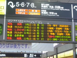 11:52相変わらずの電光掲示板のデカさです。 これから、2段目に表示されている「快速マリンライナー29号」に乗って高松へ! |