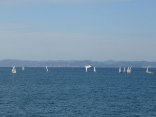 14:28海には多数のヨットが。これはなかなか良い風景です。 その向こうにはフェリーも。 |
