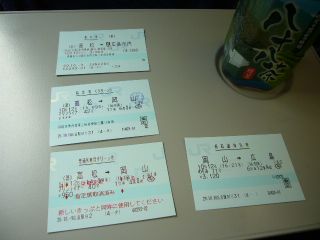15:01本日使ったキップ4枚。 今日2本目のドリンクは、高松駅構内のキヨスクで買った四万十川の「八十八茶」です。 |