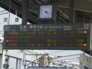16:20広島行きの幕、記念にとっておきました。 今まで「のぞみ広島行き」に出会うたびに感動していましたが、東京~広島の新幹線VS航空機争いの影響で、今やのぞみの1時間に1本は広島行き。 便利になりました。 |