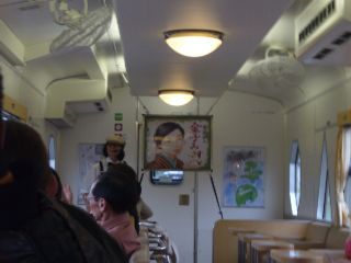 11:51滝部~人丸間では、みすゞメイトによる紙芝居が上演されました。 内容は「童謡詩人 金子みすゞ」。 金子みすゞの生涯について語ります。 これも全乗客がじっくりと見ていました。 列車内で紙芝居を行うさま、シュール! |