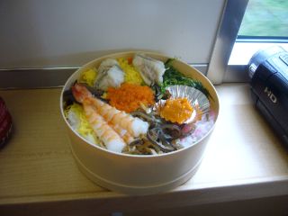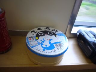 12:00正午を回ったところで駅弁タイム。 下関の駅弁は「ふくめし」が有名と聞いたのですが、どうやら季節限定だったらしく、仕方なく通年販売の「ふく寿司」を買いました。 |