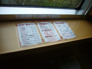 12:23座席の各テーブルには車内販売のメニューが。 瀬戸内マリンビューにも同じようにあります。 |