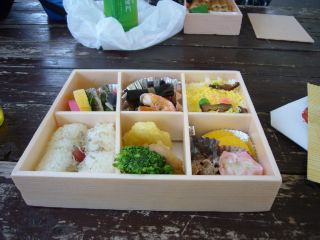12:15上がる前に、タワー前の広場で昼食をとります。 2人とも新山口で駅弁を買っておいてました。 ちなみに私は「幕の内きらら」(きらら博に合わせたもの?)、友人Aは「あなごめし」です。 |