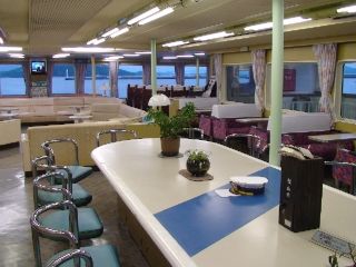 船内の様子です。 とにかく、人の気配がありません。 結局今回の乗船者数は、徒歩客は自分を入れて2人、車の客を入れても10人いるかいないかという状況。 本当に大丈夫なのか……? |