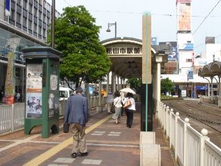 松山市駅前電停に移ります。 屋根部分に書かれている「松山市駅前」という文字がこれまたレトロチックというか、おしゃれ。 |