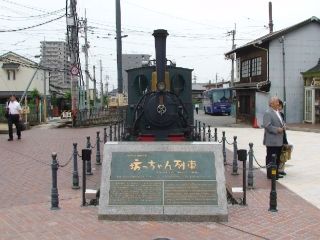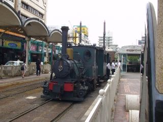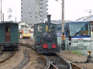 道後温泉では、方向転換の後はこんなふうに「展示物」として留置されます。 いいアイデアですが、出動時に手前の石碑が取り残される様が寂しそう。 |