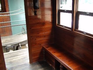 09:19 見渡す限り木製、しかも見た感じイスと壁にニスが塗りたくられてるのでレトロ感があります。 車内は本当にせまいです。 これも、「マッチ箱のような小さな汽車」と表現された当時の再現です。 |