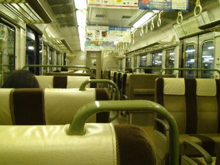 カフェオレ色車両の座席は223系と同じ転換クロスシート。 これで糸崎まではまずセーフです。 湘南色でボックスシートだったらいきなりガクッときてたところです。 |
