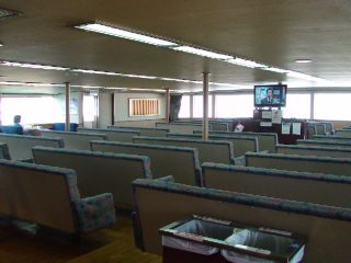 船内はこんな感じ。 至って普通の座席ですが、中距離フェリーらしく売店やゲームコーナーもちゃんとありました。 テレビは意外と地デジ対応です。 私たちはそのテレビ前に座り、甘酒片手にサンデージャポンを視聴。 初めて甘酒を飲んだのですが、冷えてたせいか…不味い。 |