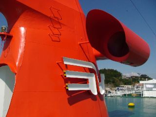 狭い急な階段を上り、甲板へ出てみました。 階段を出てすぐに煙突が。 |