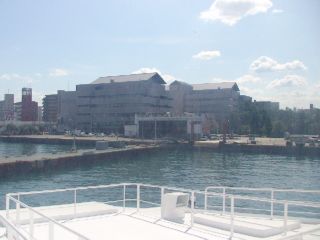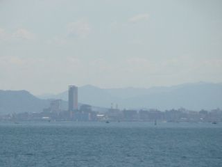 再び甲板に出て前方を見てみると…あれは高松市街か? サンポートのランドマークタワーがあるので、高松っぽいです。 「なんだ、遅れの取り戻しは意外と簡単だったか」と思いましたが、ここは線路上ではなく、海。 見た感じ近く見えても、ここからが長い。 |