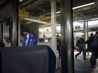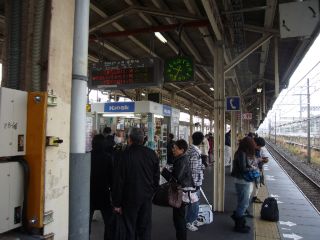 米原に到着しました。 「米原ダッシュ」と呼ばれる席取り合戦が繰り広げられると聞きましたが、接続列車の発車時刻の関係からか、ご覧の通り案外スローペースです。 |
