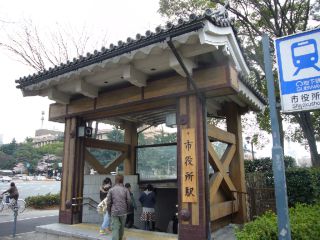 市役所駅で降ります。 駅名の看板がやけに凝ってますね。 その右にはちゃんと通常の駅名看板もあります。 |