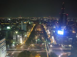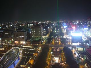 テレビ塔からの夜景です。 美しい。 レーザー光線も確認できます。結構強い光線ですね。 左下に見えるオアシス21も巡る予定でしたが、その気力は残っていそうにないです(汗) |