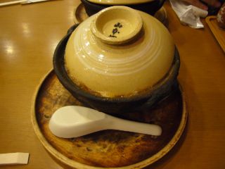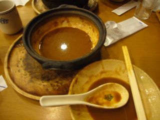 スタンダードな味噌煮込みうどんを注文。 約1000円也。 運ばれてきた直後は相当熱いと聞きましたが、今見ると…何だか準沸騰状態な気もしますが気のせいか(汗) |