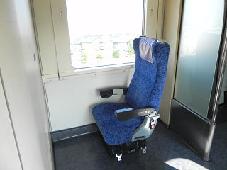 16:00そろそろ岡山に到着するので、デッキで待機します。 こちらは車イス専用座席。 このスペースを独り占めとは…乗ってみたい気もします。 |