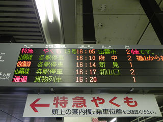 16:04岡山に到着。 16時17分発の新山口行きに乗ります。 まぁ、ここら辺の車両リニューアルは大分進んできたので、きっと転換クロスシートでしょう。 |