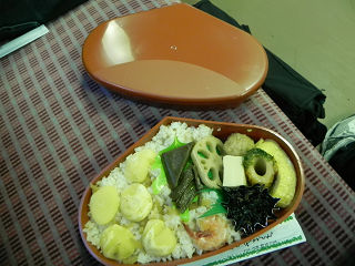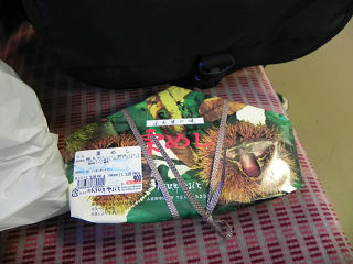 18:31先ほど駅弁屋で買った駅弁「栗めし」を車内で食べます。 クモキハも同じく栗めしを買いました。 包装紙の絵柄に凝っている辺り、さすが駅弁ですね。 |
