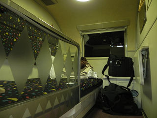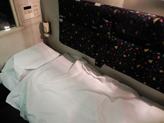 20:04ベッドメイクしたB寝台ソロベッドがこちら。 個室といえど、B寝台はB寝台。 ベッド幅は70cmです。 寝る分には支障ありませんね。大柄な人ならキツいかもしれませんが。 |