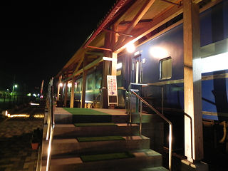19:17本日最後の「乗車」です。 ホテル「ブルートレインたらぎ」に宿泊します。 この旅行最大の目的がコレです! |