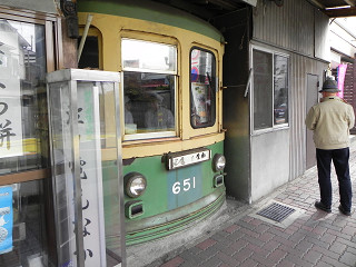 14:33更には、そこを鉄道線仕様の車両(まさに広電でいうところの「高床車」)が走るという光景。 しかも道が狭い割に交通量は多いし、結構スリリング。 |