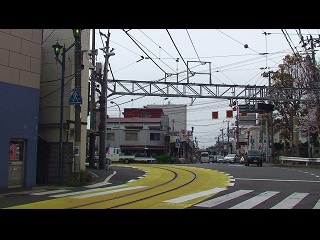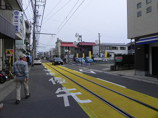 14:26道路に大きく書かれた「電車優先」の文字。 広電沿線民なので併用軌道自体は見慣れた光景なのですが、単線、そして1067mm軌間というところが新鮮です。 |