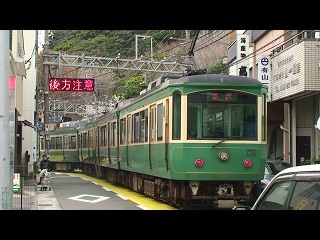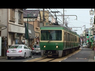 14:33車両は江ノ電最新の500形。 VVVFインバータ車です。 |