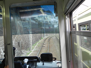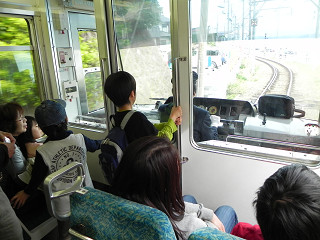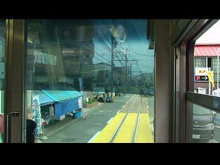 14:47先ほどの併用軌道を車内から味わいます。 駐車車両を避けようと軌道に入る自動車が前方に…。 |
