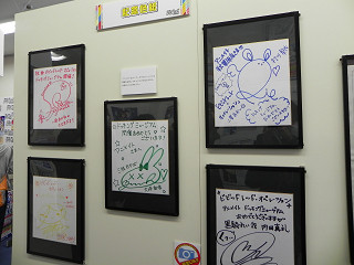 18:16カメラのマークのステッカーが貼られてたので撮影禁止かと思いきや、まさかの『撮影OK!!』という裏を返したステッカーで安心しました。 声優さんの直筆サインが展示されています。 |