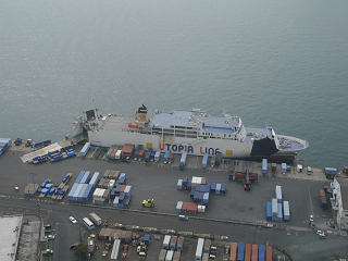 11:23港に目を向けると、停泊中の貨物船も。 |