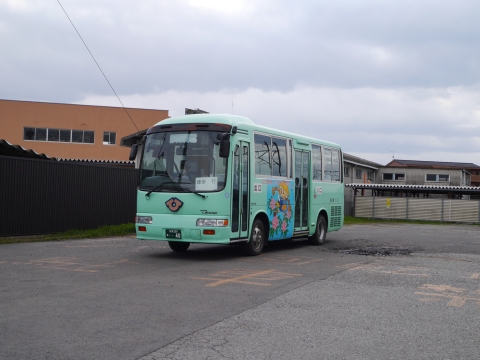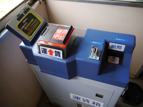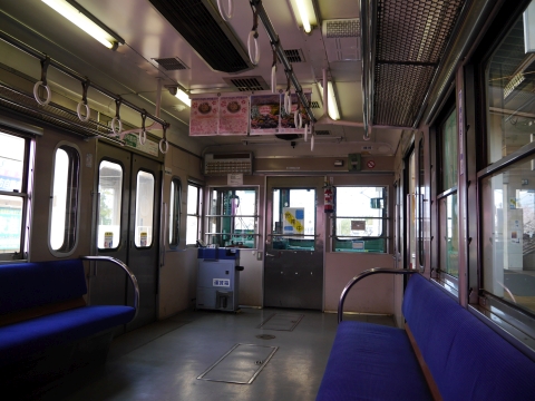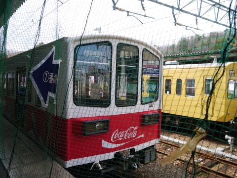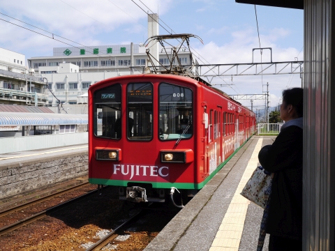 10:55赤い電車で、来た道を戻ります。 沿線にフジテックの本社があるため、このような広告電車が走っています。 |