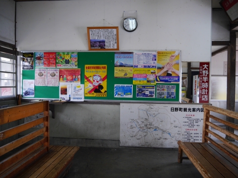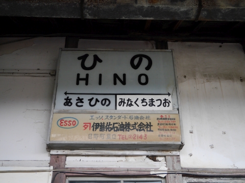 13:34日野駅に戻ってきました それにしてもこの駅舎は古い。調べると築年数は114年! 私鉄最古の駅舎とのことです。 駅名標下部の広告の電話番号も4桁のまま…。 |