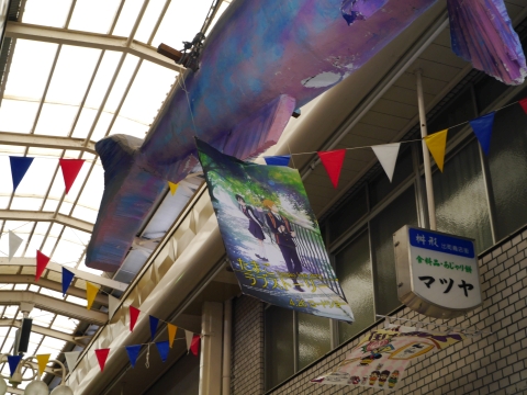 08:11たまこまーけっとの広告幕。 商店街を挙げて応援しているようです。 |