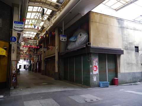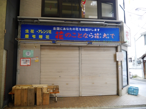 08:14お花屋の花大(ハナヒロ)さん。 作中では金髪のほんわかオネエがお店を構えています。 どこの店もまだ開店前でシャッターが閉まってます。来るのが早すぎましたね。 |