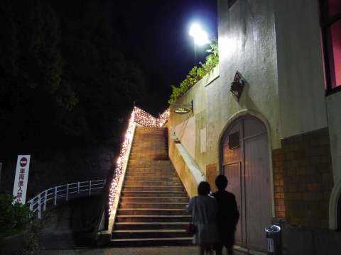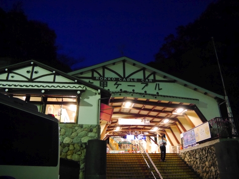 夜の神戸はロマンチックな雰囲気でテンション上がりますね(なお男二人)。 ケーブルカー駅前にはタクシーが停まっていましたが、バスはまだまだ3本ほどあるようです。 |
