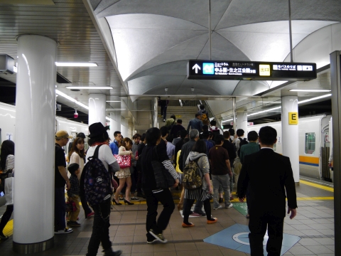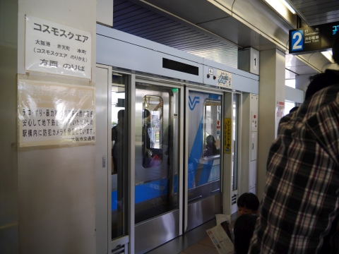 梅田からは地下鉄の御堂筋線と中央線を乗り継いで、中央線終点のコスモスクエアへ。 まどマギファンと思しきお客さんがわんさか降りていきます。 |