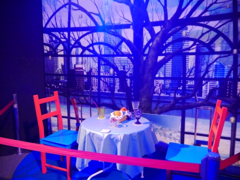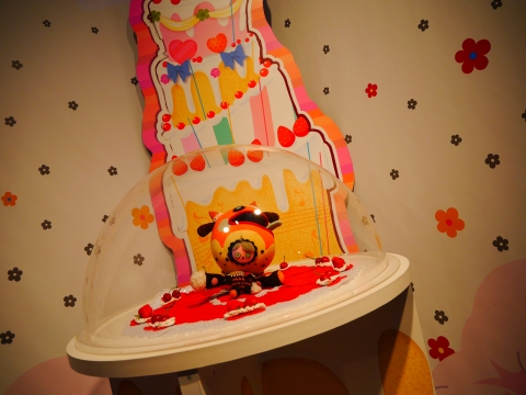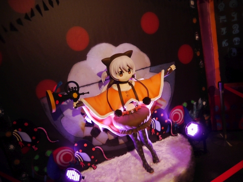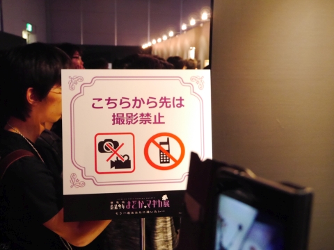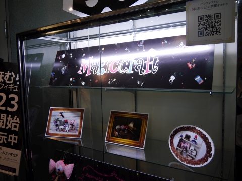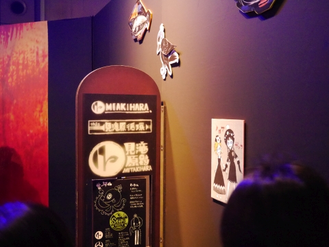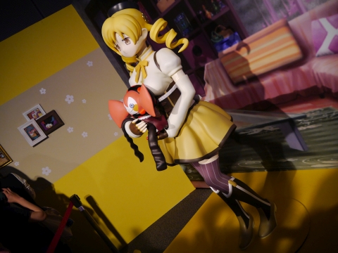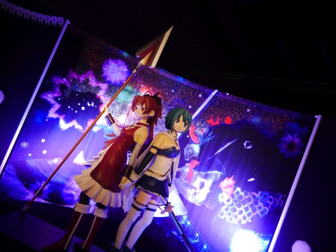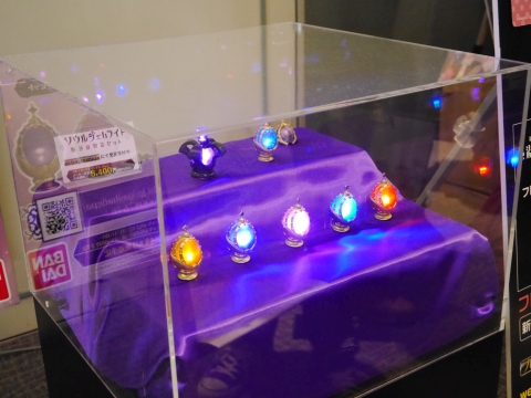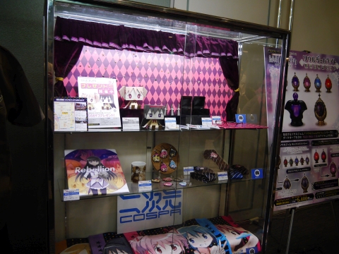 ロビーには、新作グッズの展示コーナーが設けられていました。 悪魔ほむらのフィギュアの周りは特に人だかりが激しく、マトモな写真が撮れず…。 光るソウルジェムは5,400円で買えます。 |
