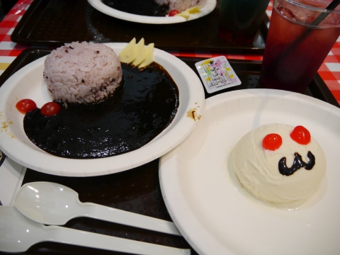 我々が注文したのは、ほむらカレー、キュゥべえアイス、ほむらドリンク。 ほむらカレーのおどろおどろしさよ…新編公開前ならもっと柔らかい見た目になってた気がします。 これもう実質、悪魔ほむらカレーですね。 |
